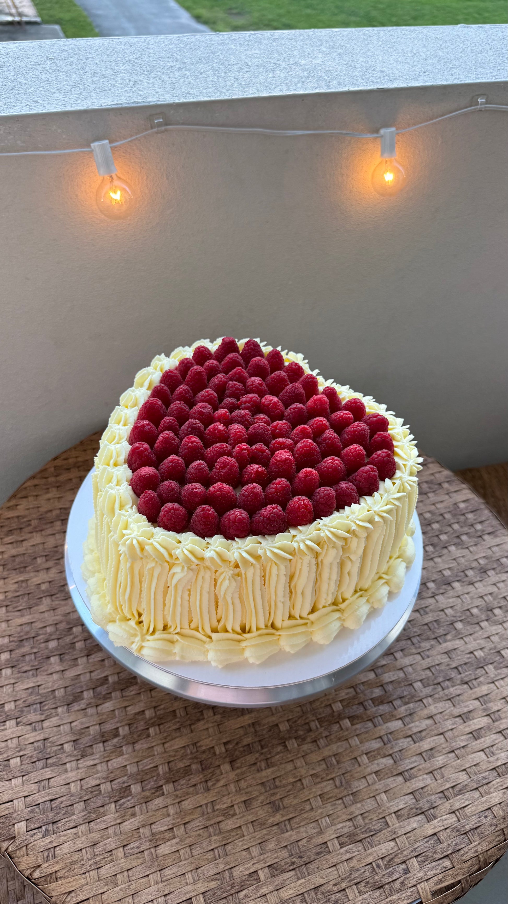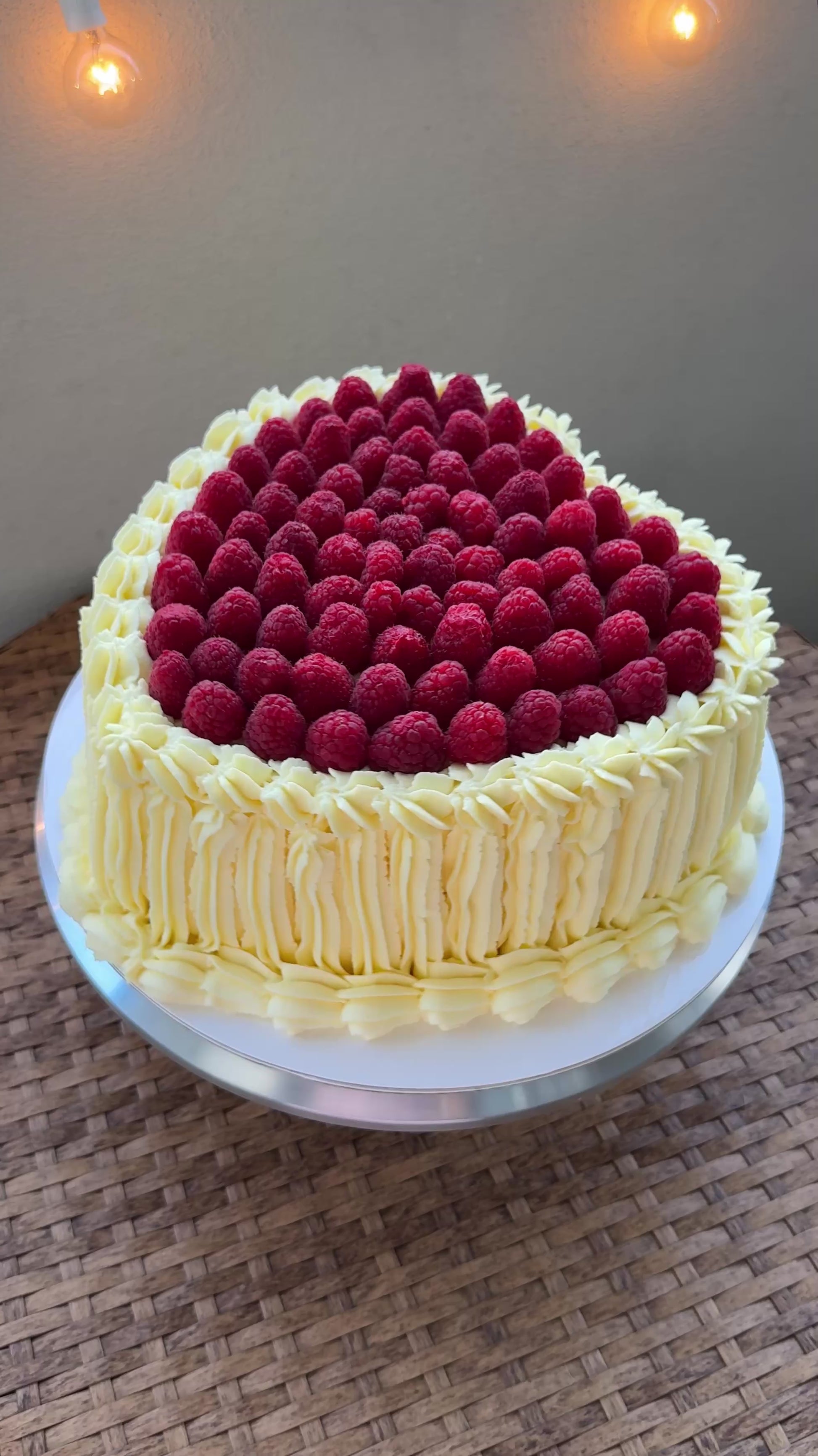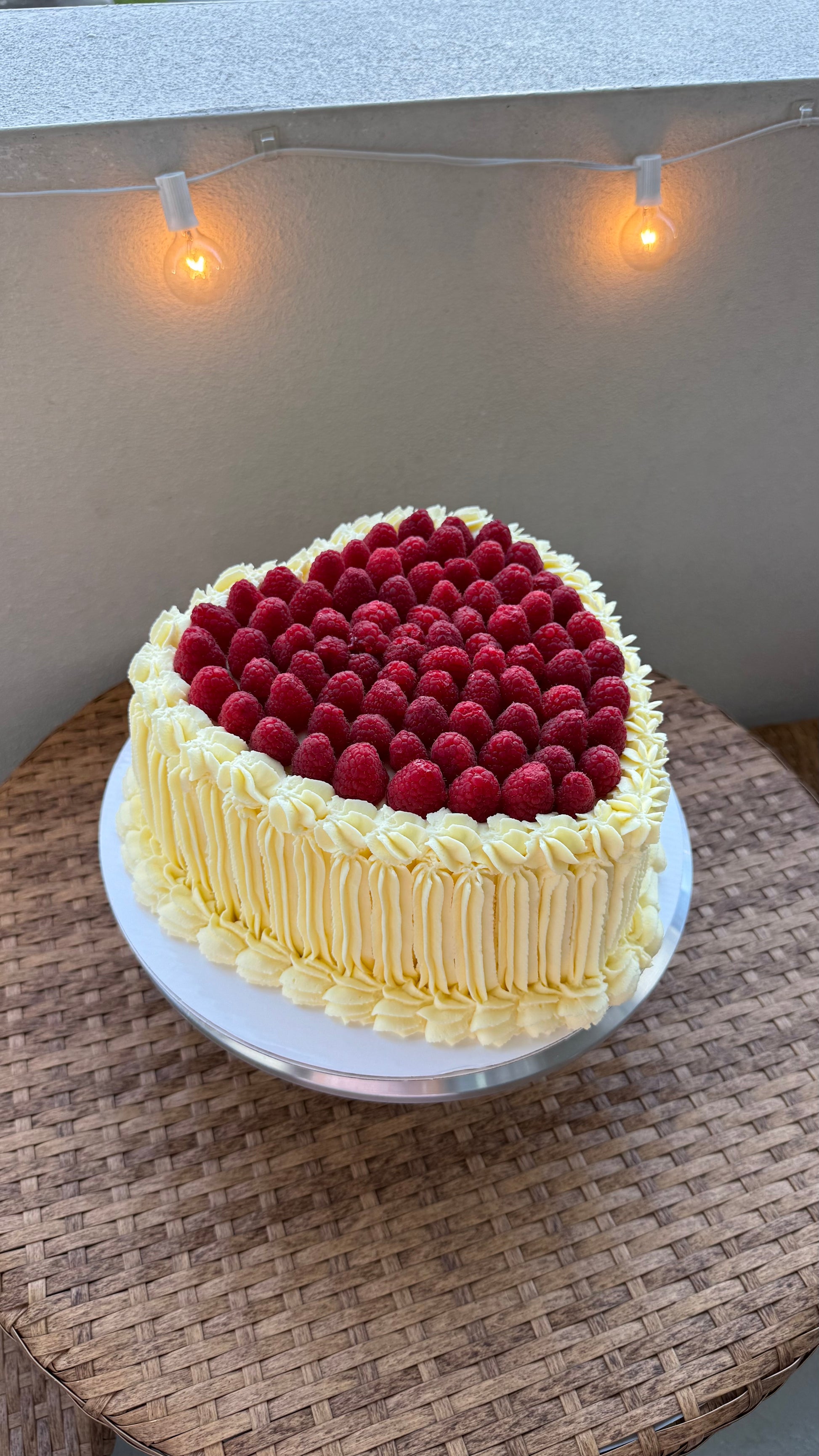 It is covered with our house cream - light, soft and barely sweet - and crowned with an abundant layer of fresh raspberries that provide a perfect contrast between sweetness and acidity.