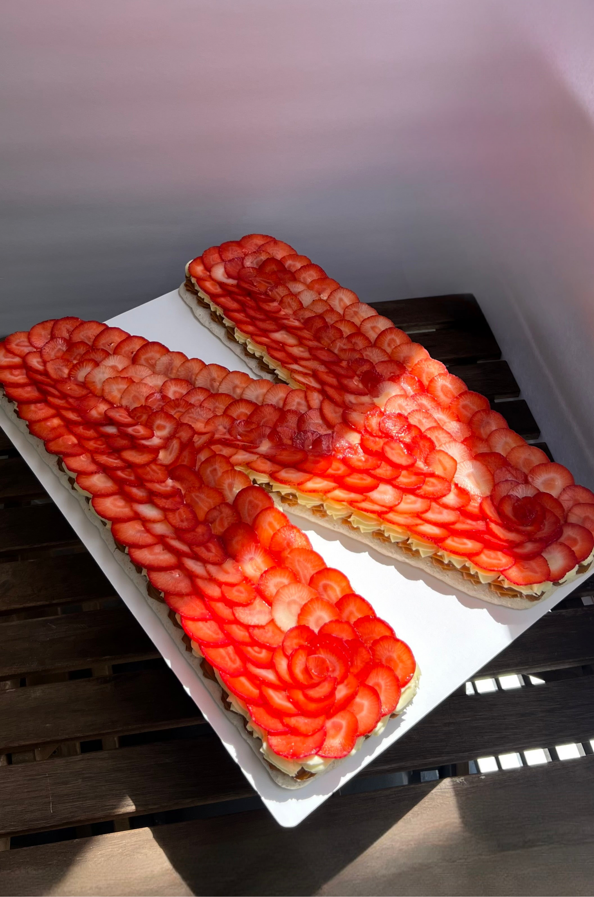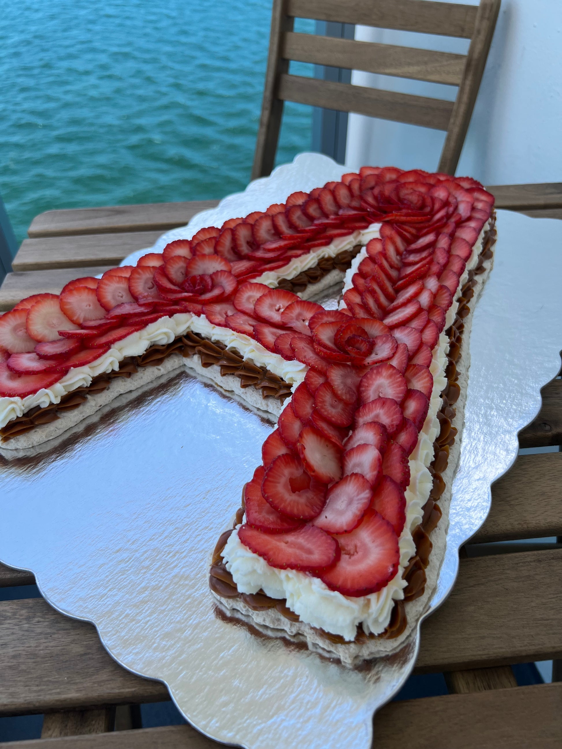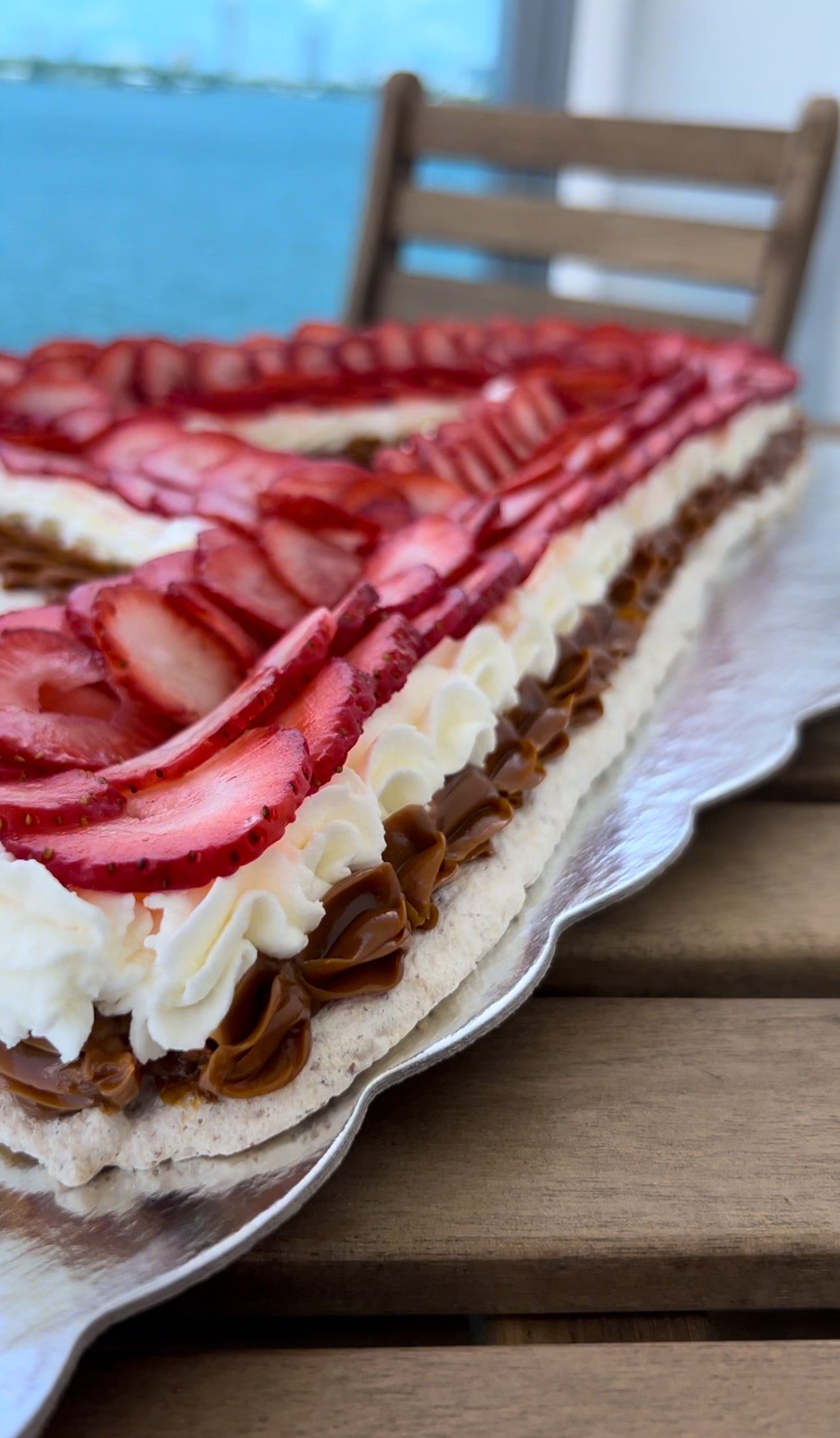Our celebrated signature cake consists of almond meringue filled with dulce de leche, house cream, and fresh fruit. It serves 20-25 guests and measures about 14" by 19", with dimensions varying slightly according to the character design requested.