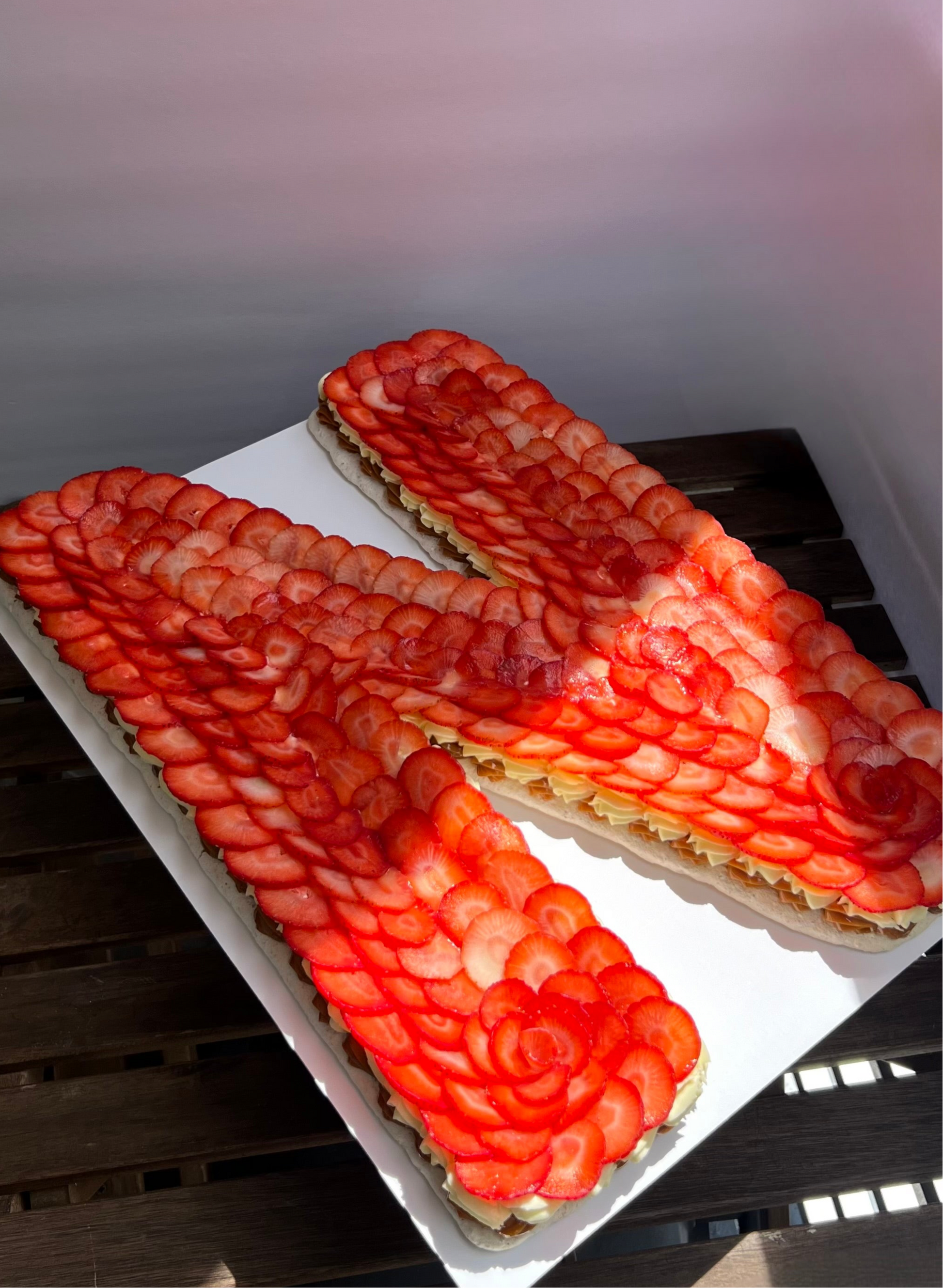 Our famous signature cake is made of almond meringue with filling of dulce de leche, whipped cream and fruits.