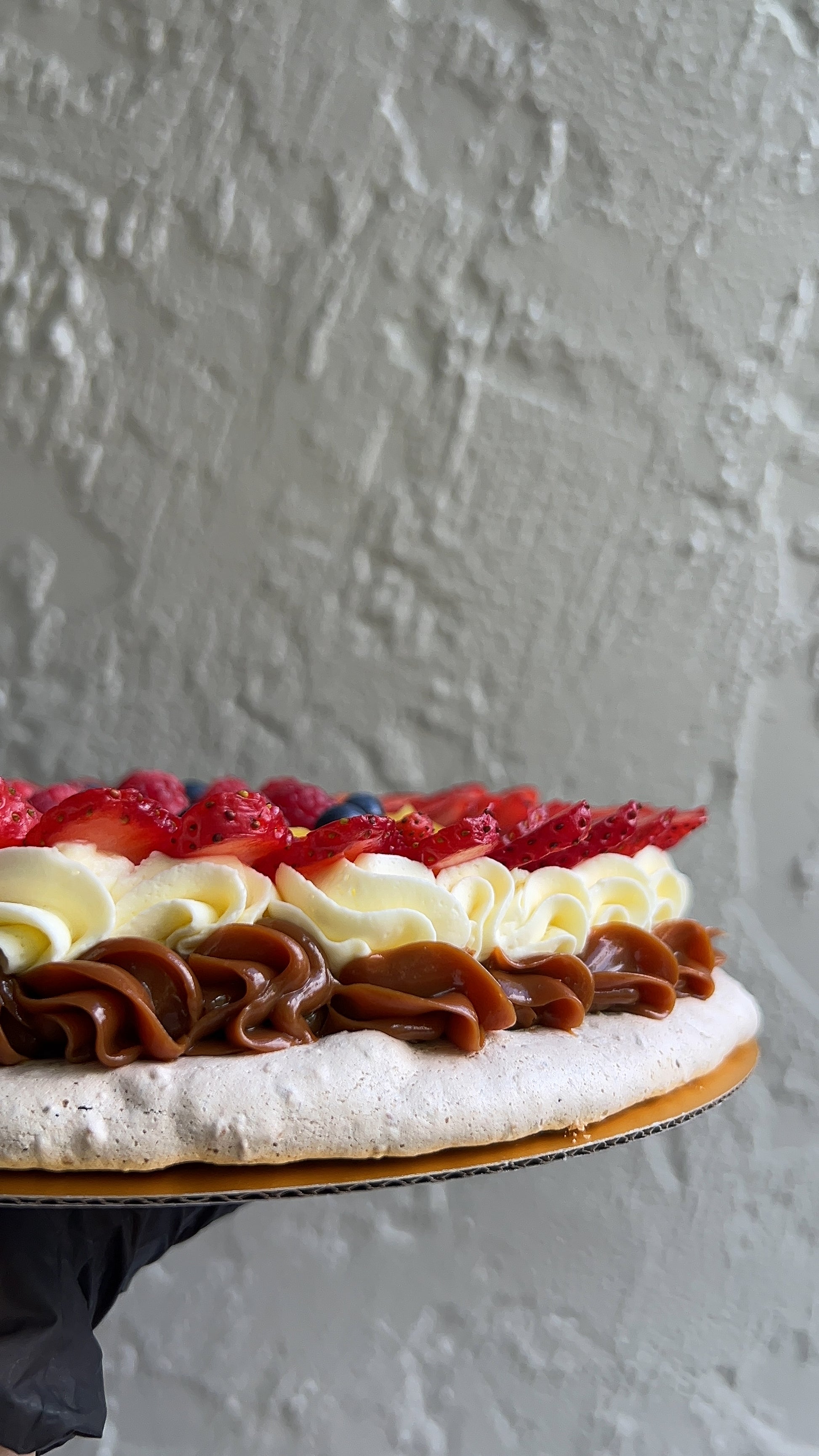 Discover the exquisite Mango Pavlova, a delicate balance of crisp meringue, luscious dulce de leche, rich house cream, and fresh strawberries. Available in three sizes—6", 9", and 12"—this dessert is expertly crafted to provide a refined combination of textures and flavors, perfect for any occasion. Enjoy a sophisticated treat that highlights the natural sweetness of mango while maintaining a light and airy finish.
