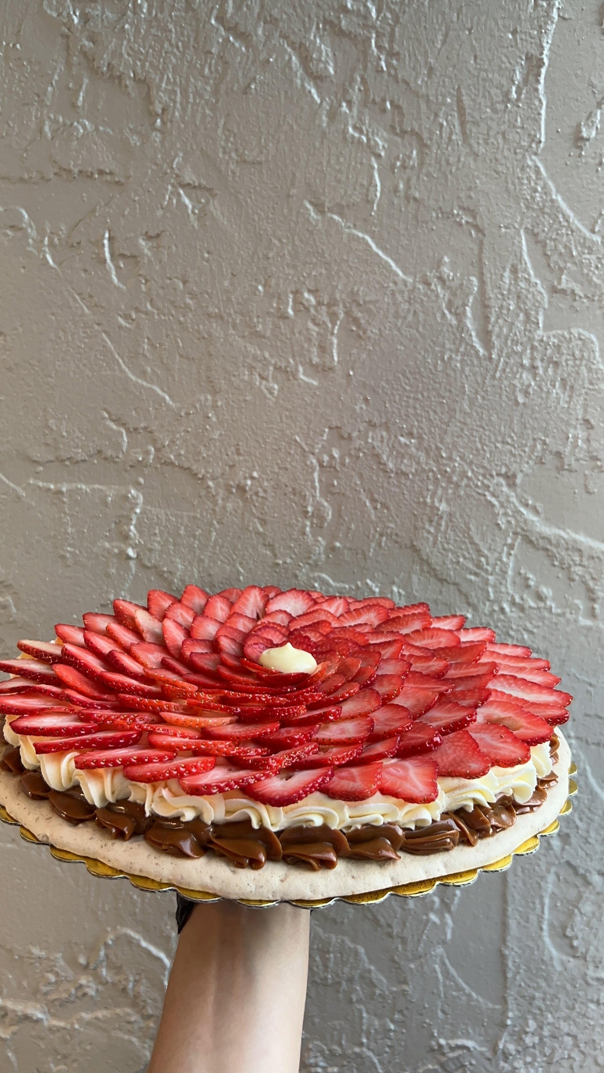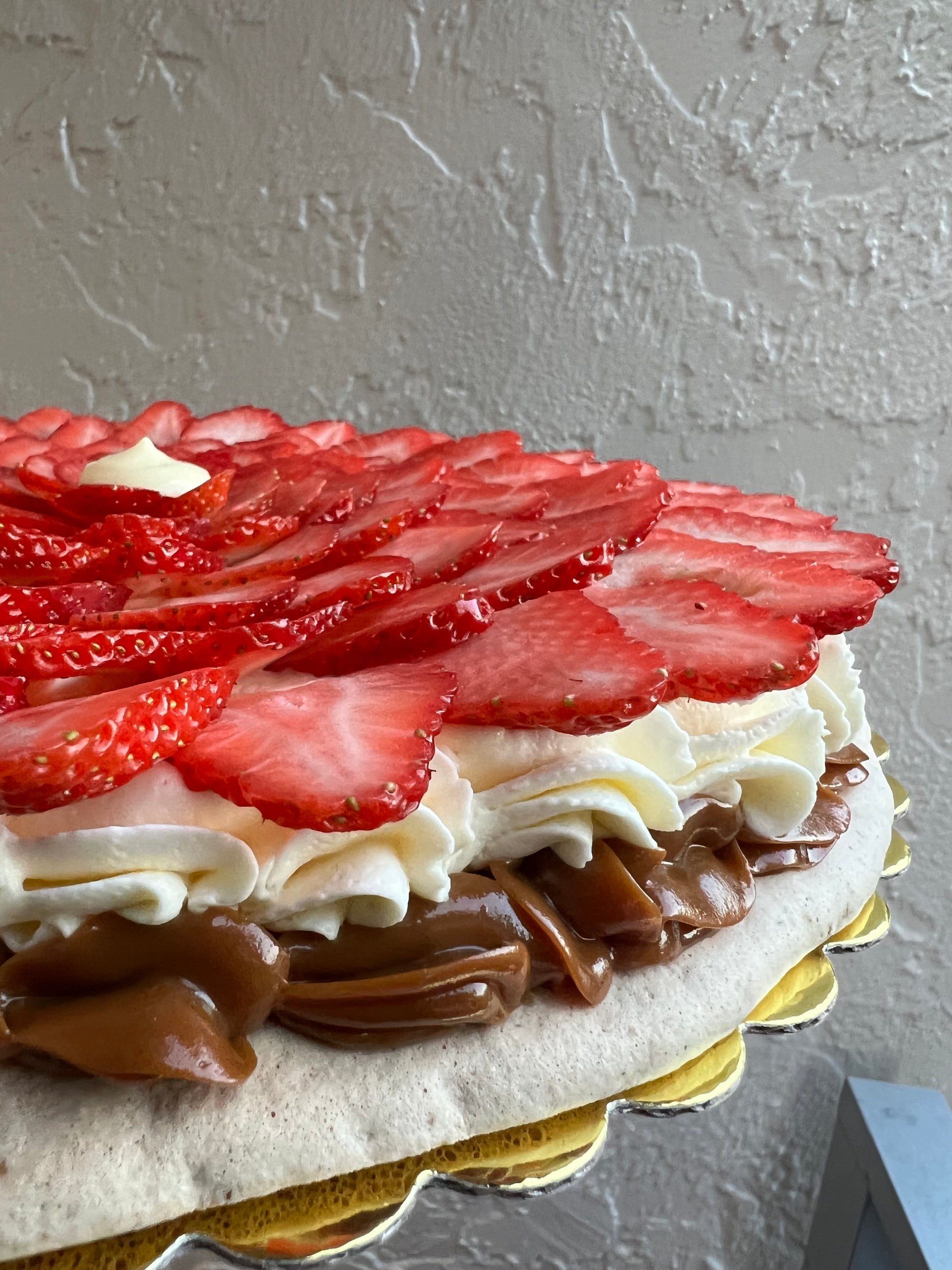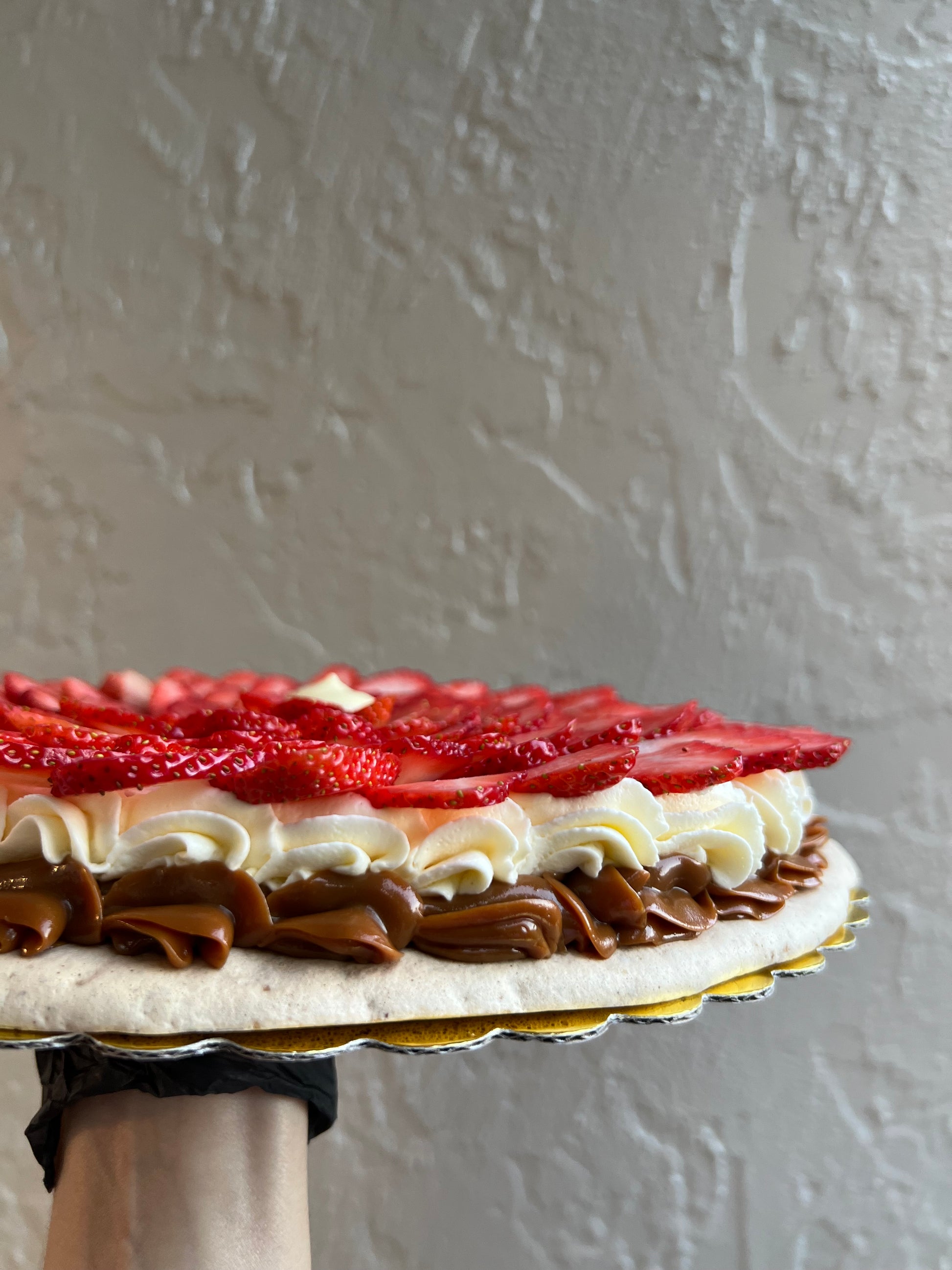 Our incredible Almond Pavlova accompanied by delicious dulce de leche, pastry cream, whipped cream and strawberry