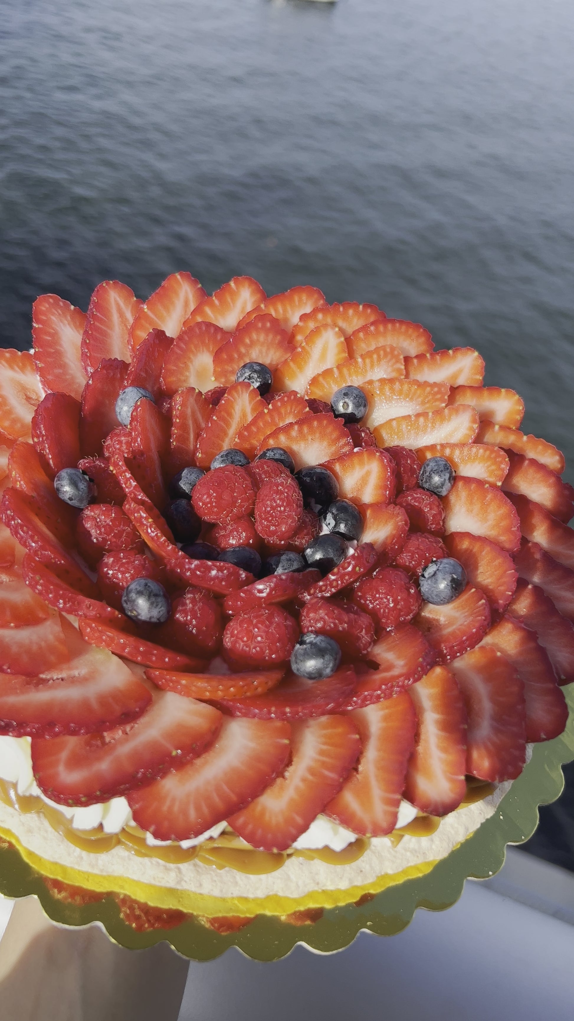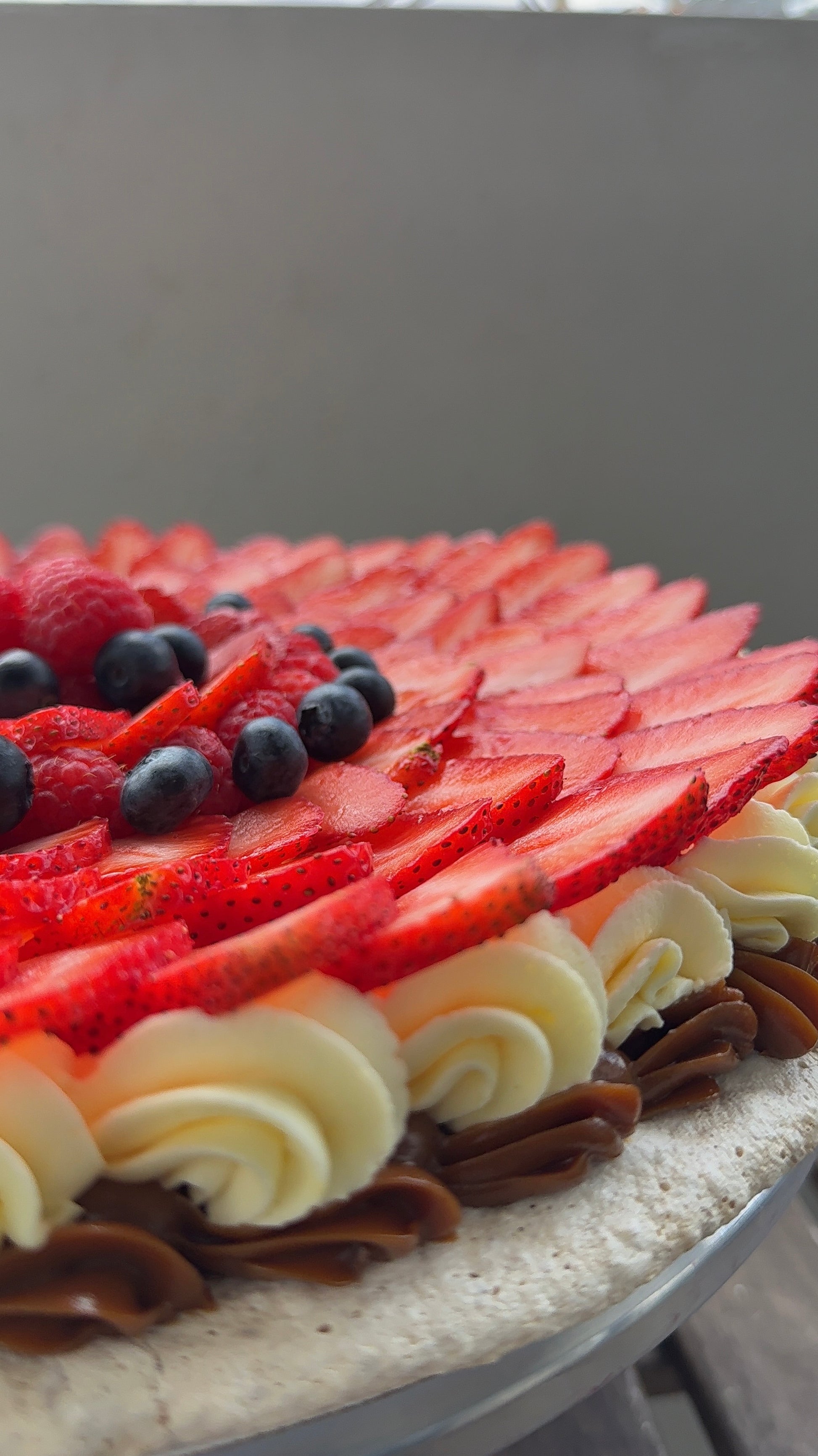 Our traditional pavlova accompanied by Strawberries, raspberries and blueberries.